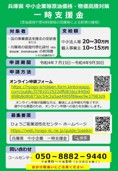 現在、兵庫県が「中小企業等原油価格・物価高騰対策一時支援金」事業を実施しています。