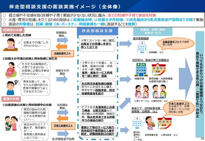 妊娠届出時から全ての妊婦・子育て家庭に寄り添い、身近で相談に応じ、関係機関とも情報共有しながら、出産・育児等の見通しを立てるための面談やその後のプッシュ型の情報発信・相談の随時受付等の継続実施を通じ、必要な支援等につなぐ。