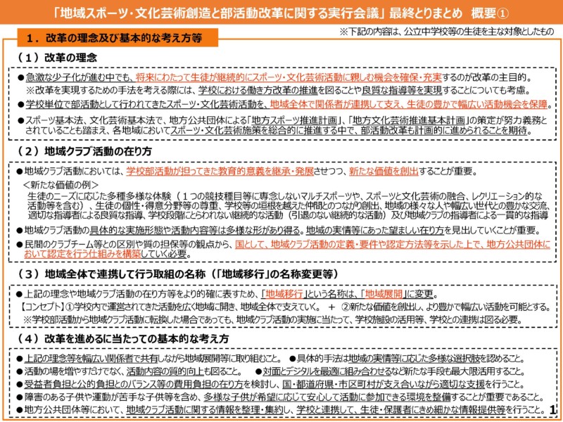 その後、本年5月に「地域スポーツ・文化芸術創造と部活動改革に関する実行会議」から最終とりまとめとして発表され、地域クラブへの土日の部活動の「地域展開」は避けて通れない状況となりました。