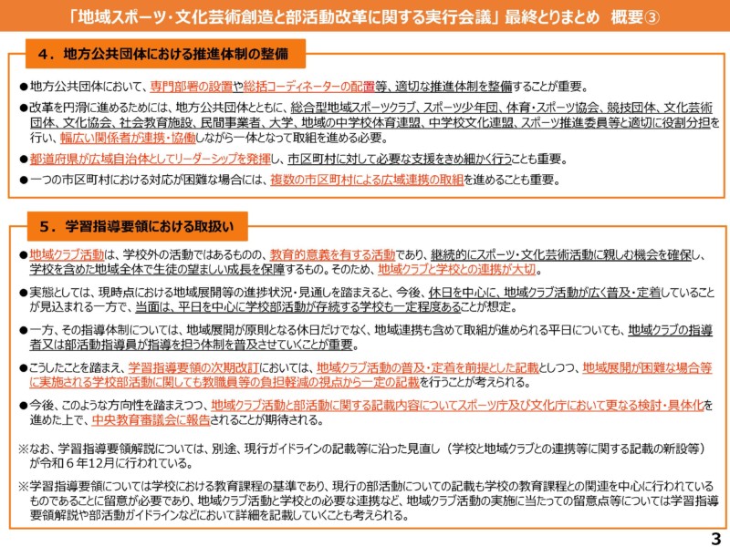 国では3年前、令和4年6月にスポーツ庁が「運動部活動の地域移行に関する検討会議提言」を、同年8月に文化庁が「文化部活動の地域移行に関する検討会議提言」を発表していました。そこでは、「部活動の地域移行」という名称が使用されていました。