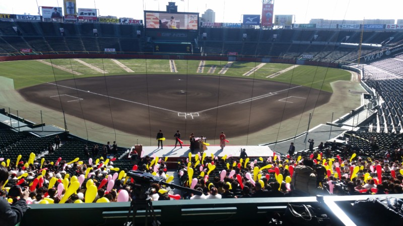 式典終了後、少し間をおいて、タイガース戦の7回裏の攻撃前にかかるラッキー7の曲に続いてのジェット風船飛ばしが行われました。阪神甲子園球場とららぽーと甲子園のご協賛を頂いたそうです。この時間にも工夫がみられ、新成人がお互いへのエールとお祝いを兼ねた感じで、大盛り上がりでした。風船が舞っているシーンはfacebookに動画を投稿しています。