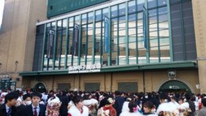 球場の外にもたくさんの新成人が集まっていました。