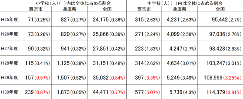 そして、この法律が制定された翌年から、西宮市では、国や県の生徒全体に対する割合が上回るほどに急増したのです。