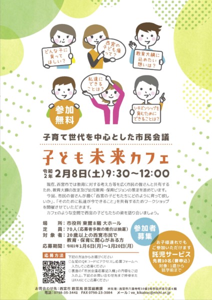 そして早速、新型コロナウイルス感染症が拡大する直前、令和2年2月8日(土)に西宮市主催で開催された「こども未来カフェ」に参加させてもらいました。このイベントの本来の目的は、「西宮市教育大綱」の見直しの際の参考とするためと思われますが、幼児教育・保育ビジョンの策定にあたっても参考になると思われる意見も聞かせてもらえました。