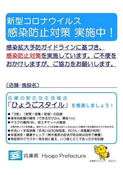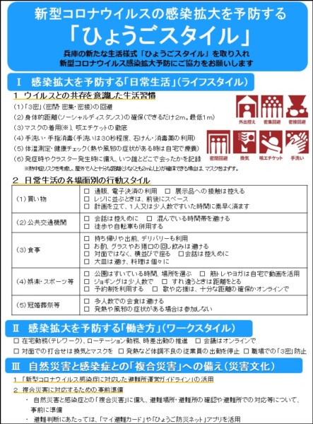 ↑「ひょうごスタイル」です。厚生労働省が示した「新しい生活様式」に「自然災害と感染症との複合災害への備え」を加え、兵庫らしさを表現した感じです。