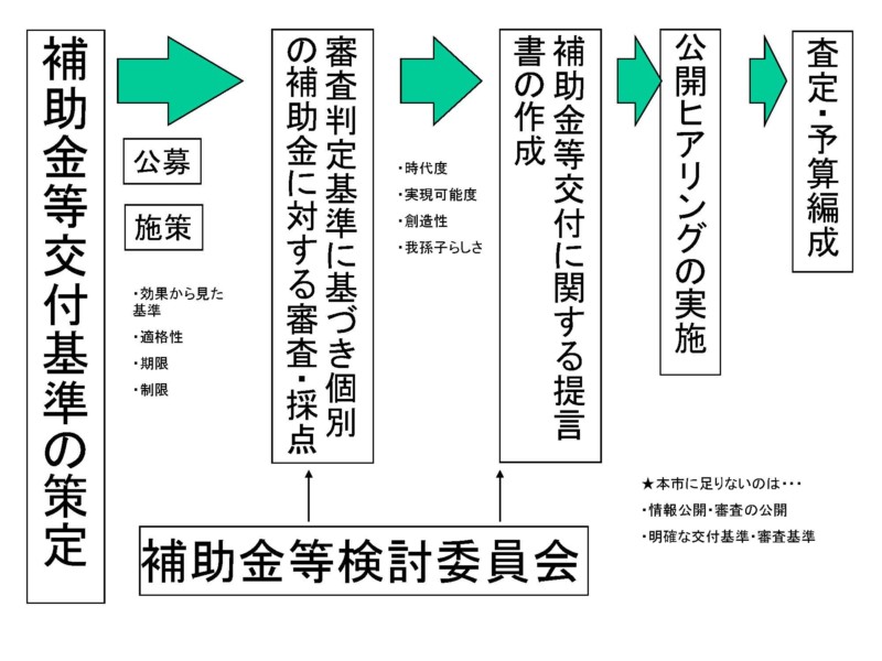 その結果を提言書として検討委員会がまとめ、この提言書を市長に対して提出するのですが、その前に、こちらの点数をつけた段階で低い評価、点数が低かった補助金に関しては、その該当する団体等が公開ヒアリングによって再度PRができる場も用意されています。そうした手続を経て、市長の査定を受け、予算編成が行われるという手順です。