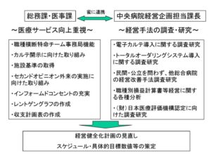 この二つの部署は、当然、密に連携をとらなければなりません。これらの取り組みの結果を見て、経営健全化計画の見直しや、スケジュール、具体的目標数値等を策定することを提案致しますが、こうした病院組織の活性化に向けた取り組みについていかがお考えかを伺います。