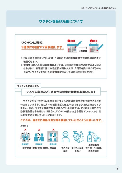 「ワクチンを打てば、マスクをせずに遊びに行ける!」、「ワクチンを接種することによってコロナ前の元の生活に戻る!」と期待している方も多いのではないかと感じています。しかし、厚生労働省が作成したパンフレットには、ワクチン接種後も「マスクの着用など感染予防対策の継続をお願いします。」とあります。
