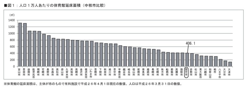 少しデータが古くなってしまいましたが、こちらの資料(←クリックするとグラフを記したPDFファイルが開きます。)にありますとおり、人口一人当たりの市立体育館の延べ床面積を、西宮市と同じ中核市の中で比較すると、45市中36位と下位にあり非常に少ない状況となっています。