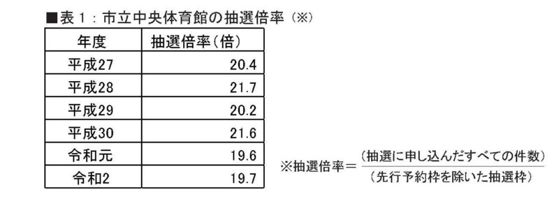 これまで、既存の学校体育館をもっと活用するよう求め、教育委員会の御協力を頂いてきました。そして、現在の中央体育館の抽選倍率を勘案すると、仮に(現在の計画のまま)再整備して予約枠が2倍になったとしても、まだ不足することが予想されます。