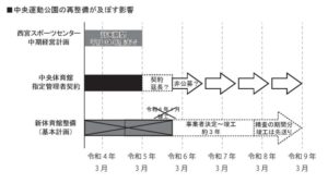 中央運動公園の再整備事業により、スポーツセンターの移転先やスポーツ教室などの自主事業、そして、再整備後の施設への関与など、どのような影響が見込まれていたのか、また、今回の見直し検討によってどのような影響が生じるとお考えなのか、お尋ね致します。