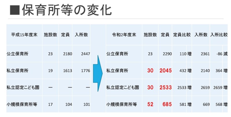 市立保育所は現在23園あり、私が初当選する直前に公立保育所が民間移管されて以降も、民間の保育所や認定こども園を増やし、施設数も定員も3倍になっています。