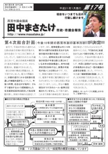 田中まさたけ活動記 第17号 2015年1月26日[カテゴリ:] ●第4次総合計画が決定 ●一般質問の概要(小連体・中連体の中断/複数志願制度における進路指導/交通安全対策/公共交通の利便性/総合的な交通計画の策定) ●TOPICS(西宮市立中央病院の経営難)